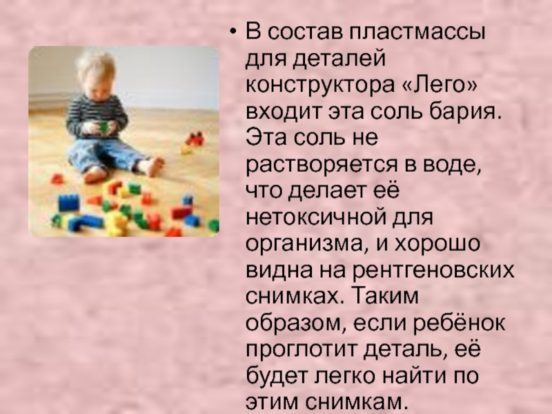Слайд 26В состав пластмассы для деталей конструктора «Лего» входит эта соль бария.