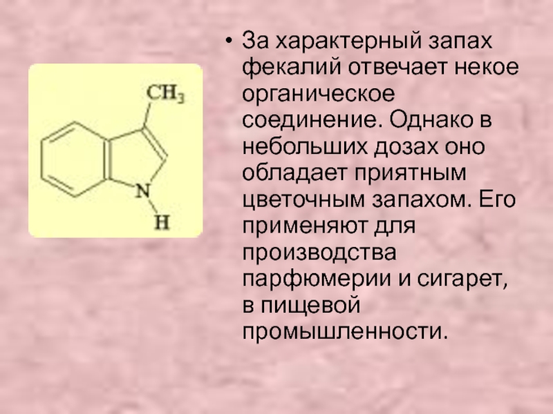 Слайд 22За характерный запах фекалий отвечает некое органическое соединение. Однако в небольших