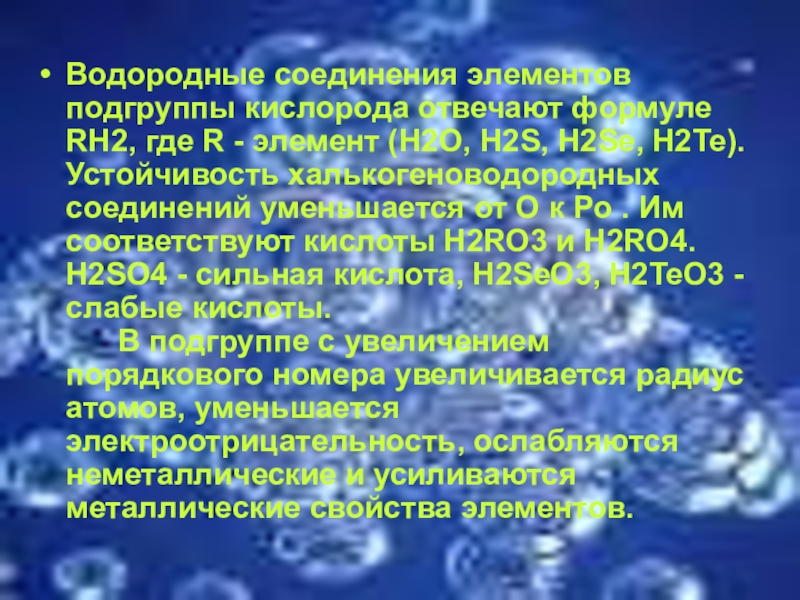 элемент (H2O, H2S, H2Se, H2Te). Устойчивость халькогеноводородных соединений уменьшается от O к Po . Им соответствуют кислоты H2RO3 и H2RO4. H2SO4 - сильная кислота, H2SeO3, H2TeO3 - слабые кислоты.