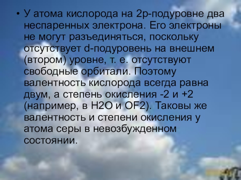 могут разъединяться, поскольку отсутствует d-подуровень на внешнем (втором) уровне, т. е. отсутствуют свободные орбитали. Поэтому валентность кислорода всегда равна двум, а степень окисления -2 и +2 (например, в Н2О и ОF2). Таковы же валентность и степени окисления у атома серы в невозбужденном состоянии.