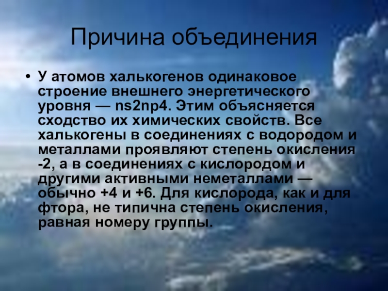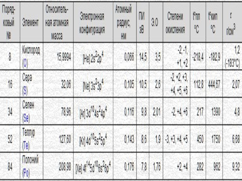 Этим объясняется сходство их химических свойств. Все халькогены в соединениях с водородом и металлами проявляют степень окисления -2, а в соединениях с кислородом и другими активными неметаллами — обычно +4 и +6. Для кислорода, как и для фтора, не типична степень окисления, равная номеру группы.