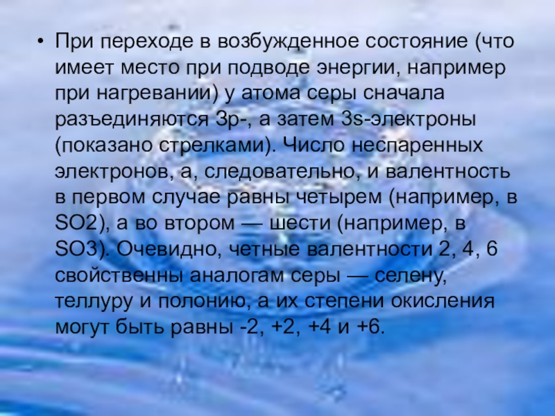 например при нагревании) у атома серы сначала разъединяются Зр-, а затем 3s-электроны (показано стрелками). Число неспаренных электронов, а, следовательно, и валентность в первом случае равны четырем (например, в SO2), а во втором — шести (например, в SO3). Очевидно, четные валентности 2, 4, 6 свойственны аналогам серы — селену, теллуру и полонию, а их степени окисления могут быть равны -2, +2, +4 и +6.