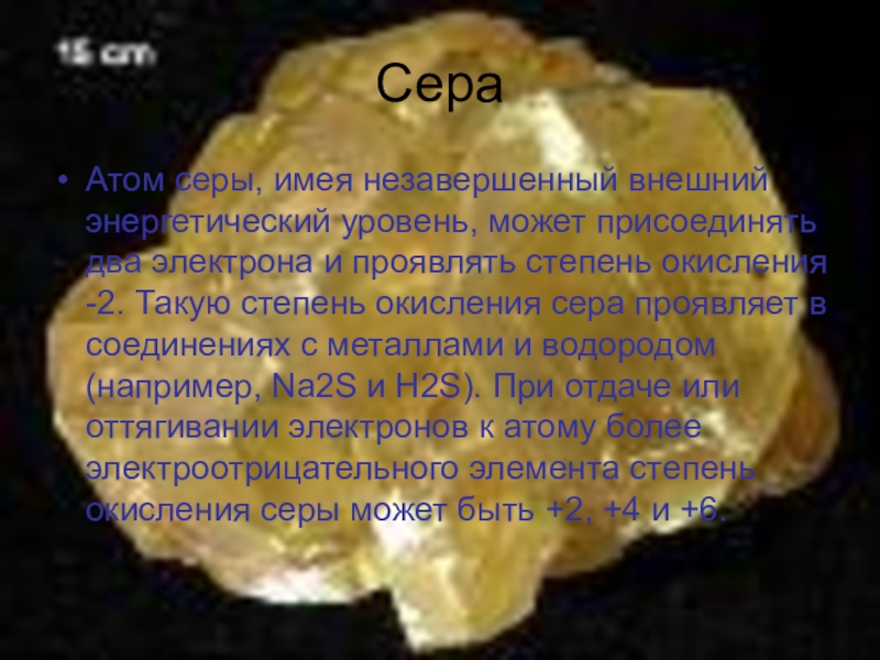 и проявлять степень окисления -2. Такую степень окисления сера проявляет в соединениях с металлами и водородом (например, Na2S и Н2S). При отдаче или оттягивании электронов к атому более электроотрицательного элемента степень окисления серы может быть +2, +4 и +6.