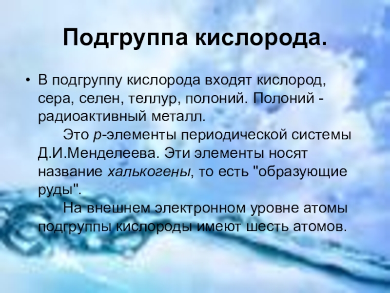 В подгруппу кислорода входят кислород, сера, селен, теллур, полоний.