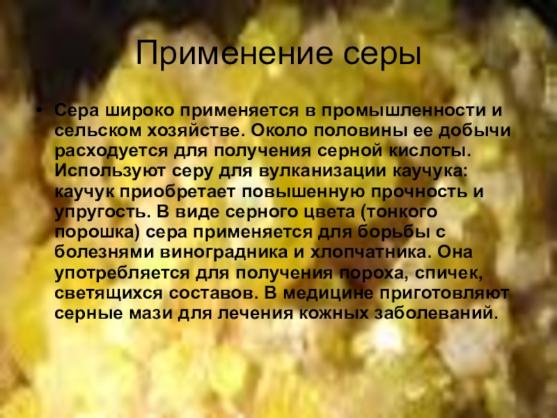 ее добычи расходуется для получения серной кислоты. Используют серу для вулканизации каучука: каучук приобретает повышенную прочность и упругость. В виде серного цвета (тонкого порошка) сера применяется для борьбы с болезнями виноградника и хлопчатника. Она употребляется для получения пороха, спичек, светящихся составов. В медицине приготовляют серные мази для лечения кожных заболеваний.