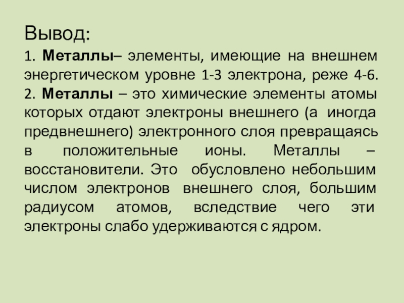 Слайд 12Вывод: 1. Металлы– элементы, имеющие на внешнем энергетическом уровне 1-3 электрона,