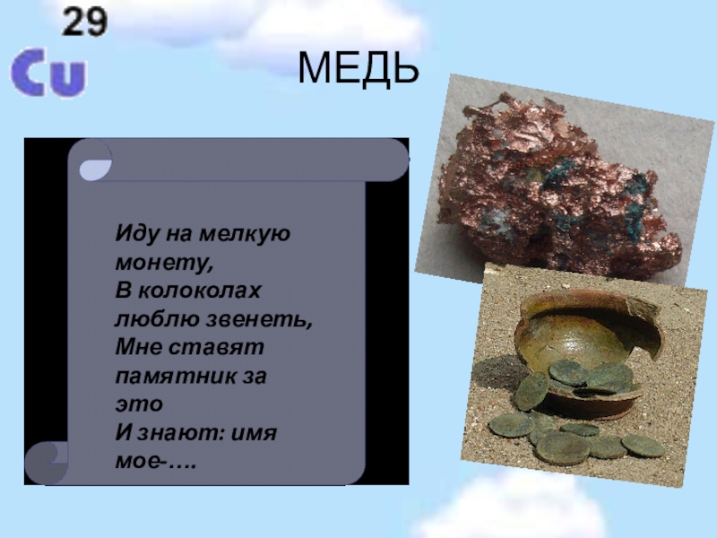 МЕДЬИду на мелкую монету, В колоколах люблю звенеть, Мне ставят памятник за это И знают: имя мое-….