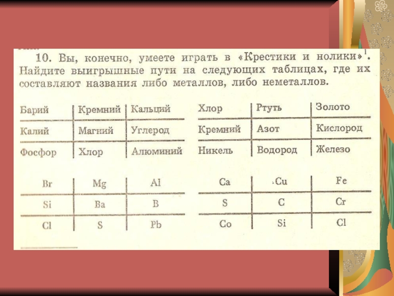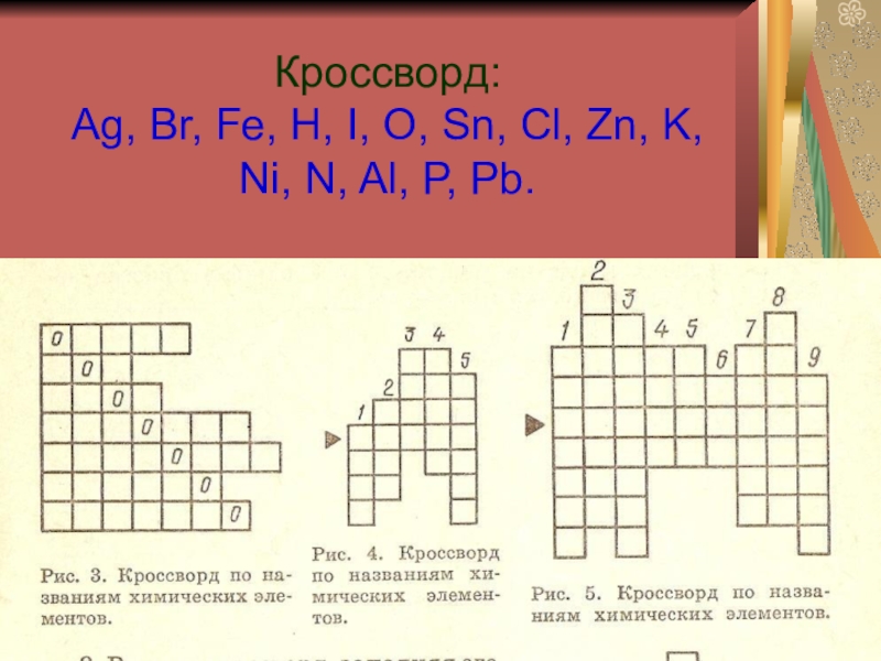 Слайд 5Кроссворд: Ag, Br, Fe, H, I, O, Sn, Cl, Zn, K, Ni,