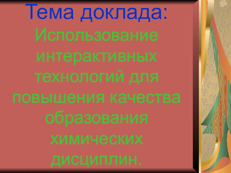 Слайд 1 Тема доклада: Использование интерактивных технологий для повышения качества образования химических дисциплин.