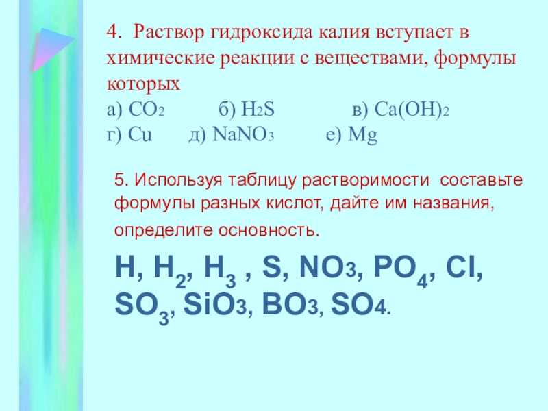 5. Используя таблицу растворимости составьте формулы разных кислот, дайте им названия, определите основность.
