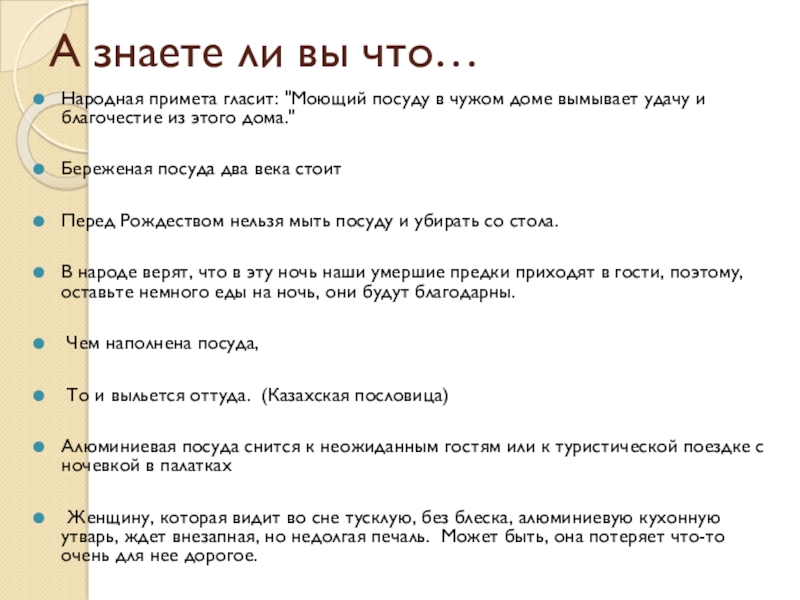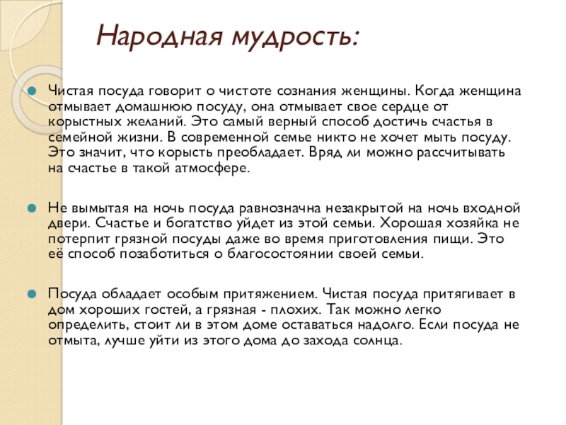 Не вымытая на ночь посуда равнозначна незакрытой на ночь входной двери. Счастье и богатство уйдет из этой семьи. Хорошая хозяйка не потерпит грязной посуды даже во время приготовления пищи. Это её способ позаботиться о благосостоянии своей семьи.