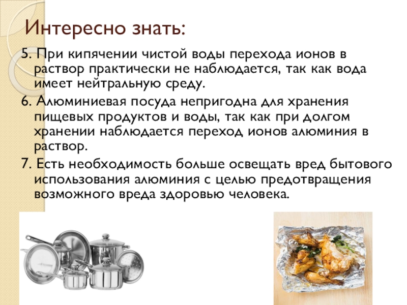 2. Опытным путем подтверждена небезопасность алюминиевой посуды, потому что при приготовлении пищи в ней ионы алюминия переходят в пищу.