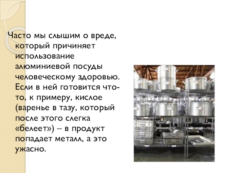 Слайд 9Часто мы слышим о вреде, который причиняет использование алюминиевой посуды человеческому