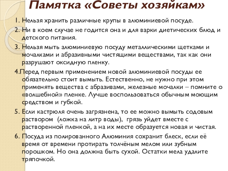 8. Пользоваться алюминиевой посудой постоянно нельзя, так как ионы алюминия могут накапливаться в организме человека, что способствует ухудшению здоровья человека.