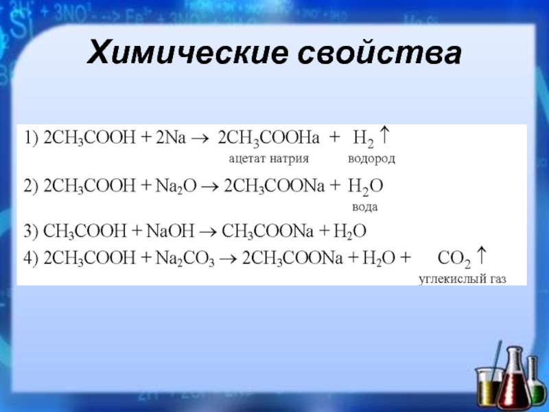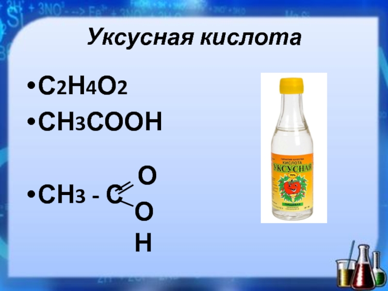 Производными этой кислоты считаются уксус – 3-9%, и уксусная эссенция – 70-80%. Эфиры и соли этой кислоты называются ацетатами.