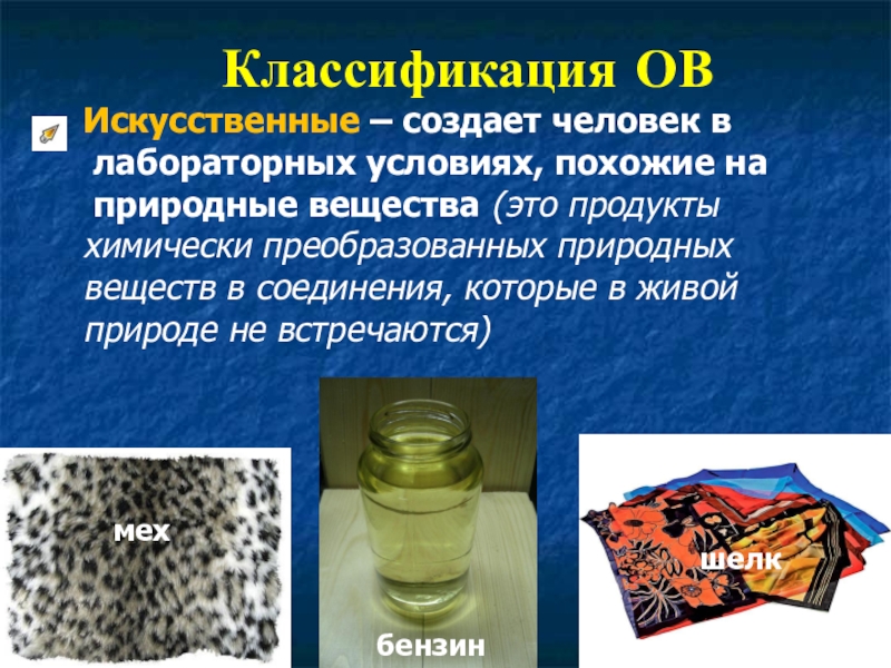 Существуют органические вещества, которых нет в природе (пластмассы, синтетические каучуки и волокна, лаки, краски, лекарства и т.д.)