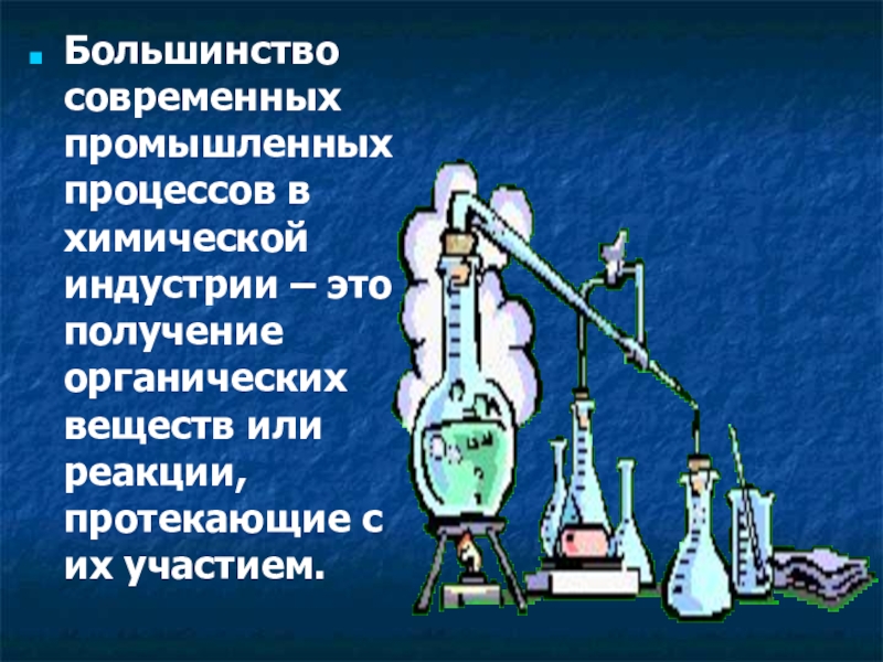 Слайд 38Большинство современных промышленных процессов в химической индустрии – это получение органических