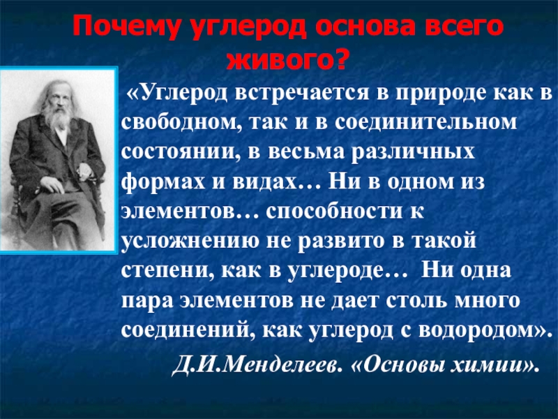 свободном, так и в соединительном состоянии, в весьма различных формах и видах… Ни в одном из элементов… способности к усложнению не развито в такой степени, как в углероде… Ни одна пара элементов не дает столь много соединений, как углерод с водородом».