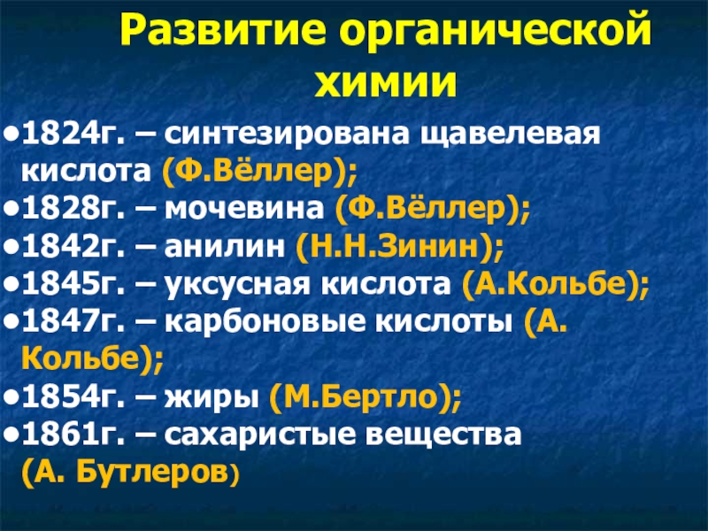 1824г. – синтезирована щавелевая кислота (Ф.Вёллер);