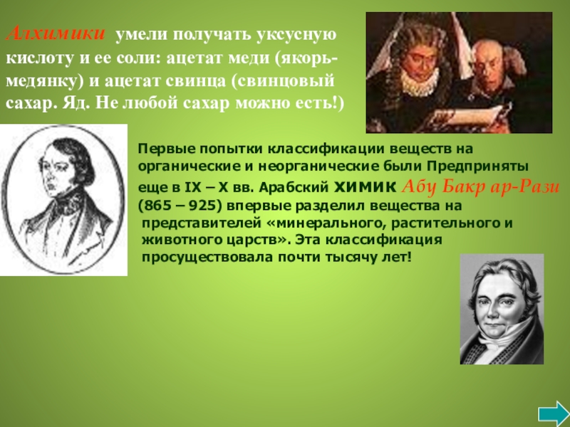 Слайд 13Алхимики умели получать уксусную кислоту и ее соли: ацетат меди (якорь-медянку)