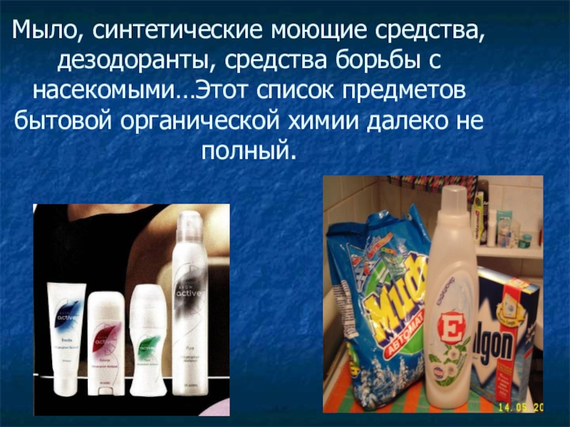 Слайд 46Мыло, синтетические моющие средства, дезодоранты, средства борьбы с насекомыми…Этот список предметов