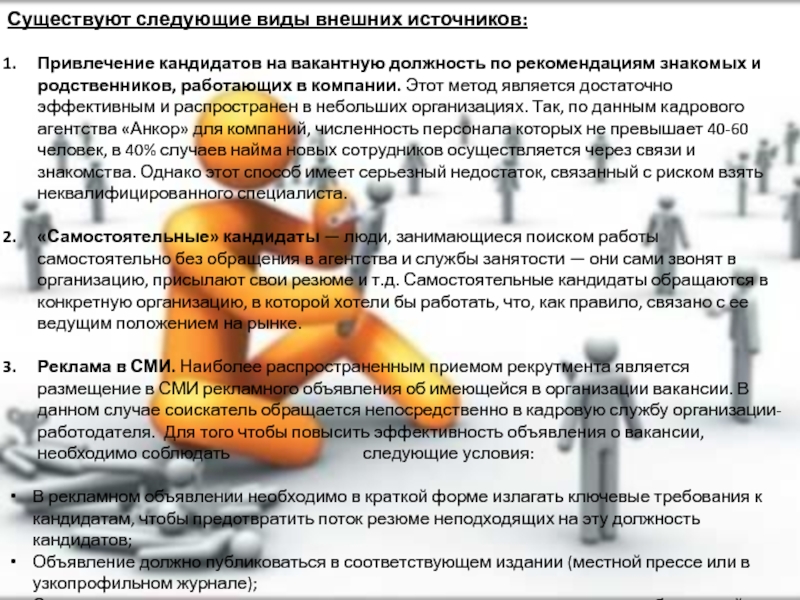 знакомых и родственников, работающих в компании. Этот метод является достаточно эффективным и распространен в небольших организациях. Так, по данным кадрового агентства «Анкор» для компаний, численность персонала которых не превышает 40-60 человек, в 40% случаев найма новых сотрудников осуществляется через связи и знакомства. Однако этот способ имеет серьезный недостаток, связанный с риском взять неквалифицированного специалиста.