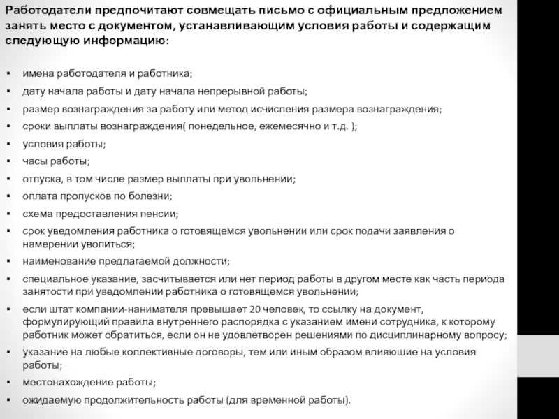 Слайд 15Работодатели предпочитают совмещать письмо с официальным предложением занять место с документом,