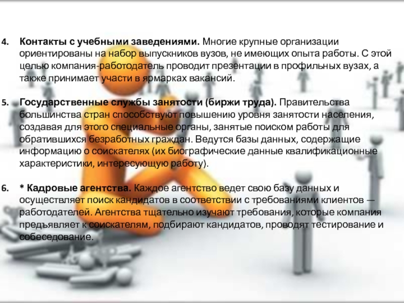 * Кадровые агентства. Каждое агентство ведет свою базу данных и осуществляет поиск кандидатов в соответствии с требованиями клиентов — работодателей. Агентства тщательно изучают требования, которые компания предъявляет к соискателям, подбирают кандидатов, проводят тестирование и собеседование.