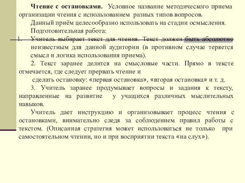 Слайд 16Чтение с остановками. Условное название методического приема организации чтения с использованием