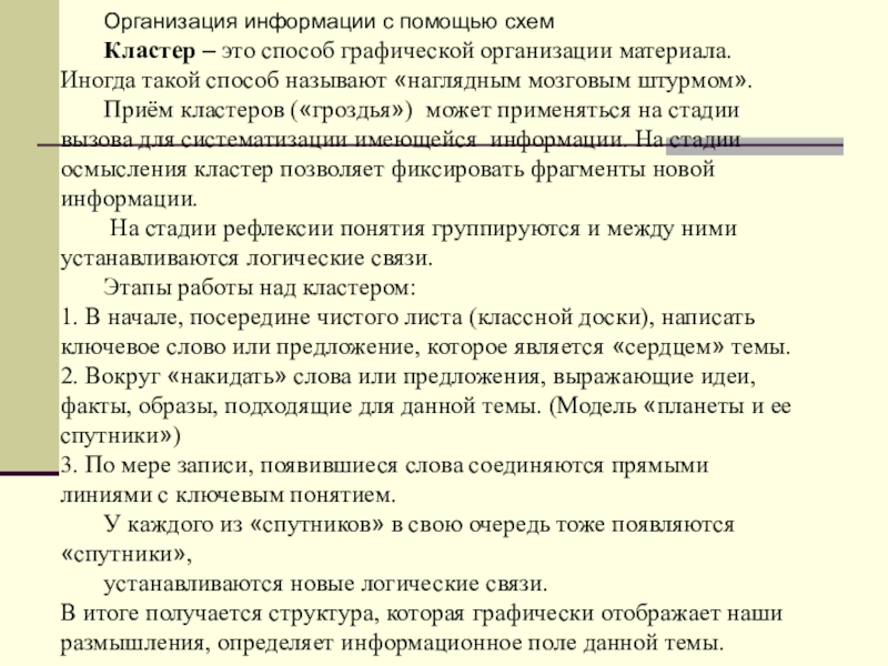Приём кластеров («гроздья») может применяться на стадии вызова для систематизации имеющейся информации. На стадии осмысления кластер позволяет фиксировать фрагменты новой информации.
