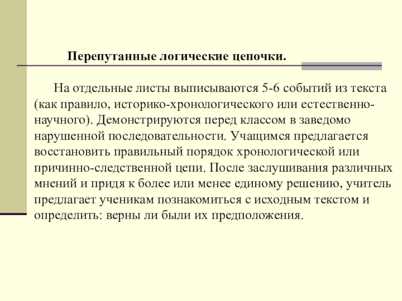 из текста (как правило, историко-хронологического или естественно-научного). Демонстрируются перед классом в заведомо нарушенной последовательности. Учащимся предлагается восстановить правильный порядок хронологической или причинно-следственной цепи. После заслушивания различных мнений и придя к более или менее единому решению, учитель предлагает ученикам познакомиться с исходным текстом и определить: верны ли были их предположения.