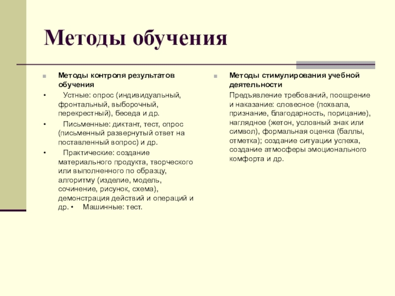 • Устные: опрос (индивидуальный, фронтальный, выборочный, перекрестный), беседа