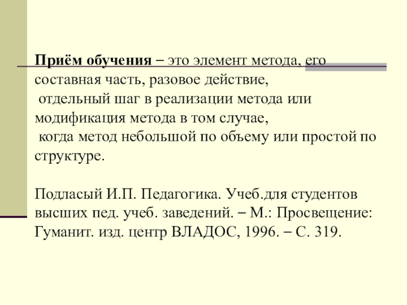 Подласый И.П. Педагогика. Учеб.для студентов высших пед. учеб. заведений. – М.: Просвещение: Гуманит. изд. центр ВЛАДОС, 1996. – С. 319.