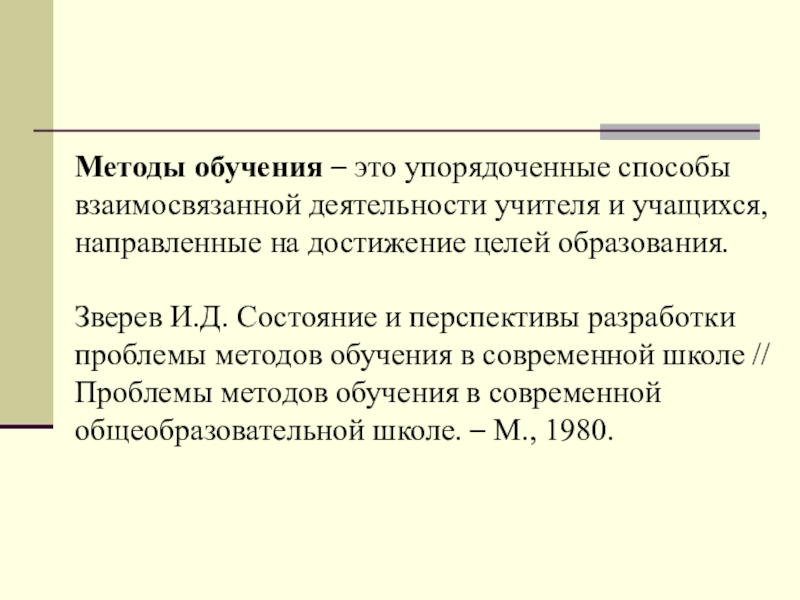Зверев И.Д. Состояние и перспективы разработки проблемы методов обучения в современной школе // Проблемы методов обучения в современной общеобразовательной школе. – М., 1980.