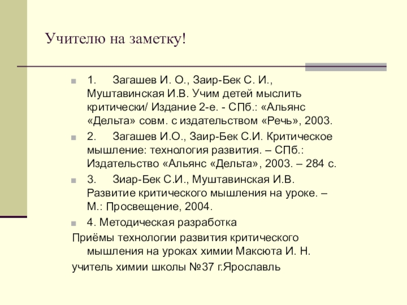 2. Загашев И.О., Заир-Бек С.И. Критическое мышление: технология развития. – СПб.: Издательство «Альянс «Дельта», 2003. – 284 с.
