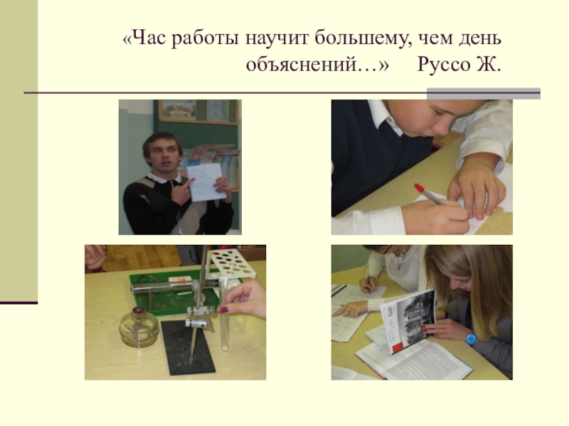 Слайд 12«Час работы научит большему, чем день объяснений…» Руссо Ж.