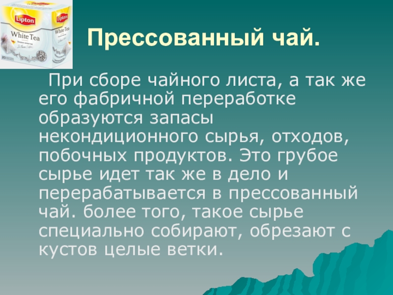 его фабричной переработке образуются запасы некондиционного сырья, отходов, побочных продуктов. Это грубое сырье идет так же в дело и перерабатывается в прессованный чай. более того, такое сырье специально собирают, обрезают с кустов целые ветки.