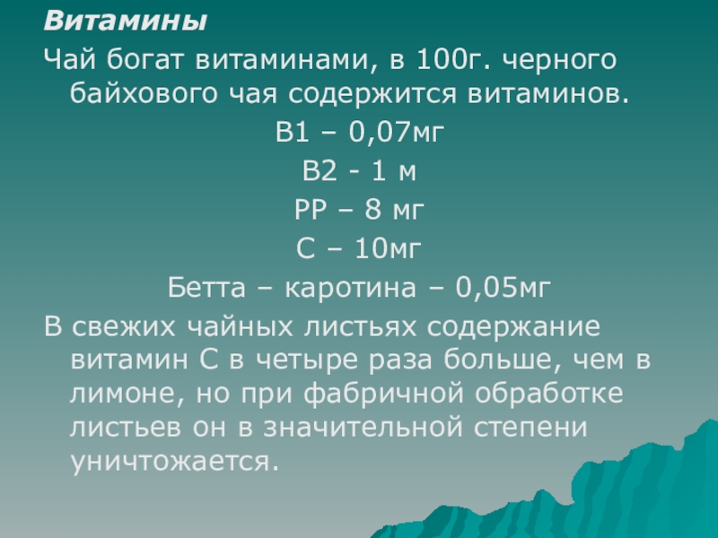 Чай богат витаминами, в 100г. черного байхового чая содержится витаминов.