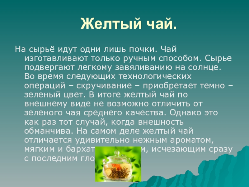 ручным способом. Сырье подвергают легкому завяливанию на солнце. Во время следующих технологических операций – скручивание – приобретает темно –зеленый цвет. В итоге желтый чай по внешнему виде не возможно отличить от зеленого чая среднего качества. Однако это как раз тот случай, когда внешность обманчива. На самом деле желтый чай отличается удивительно нежным ароматом, мягким и бархатным вкусом, исчезающим сразу с последним глотком.