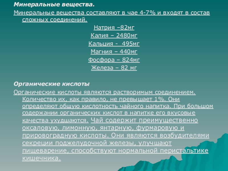 Минеральные вещества составляют в чае 4-7% и входят в состав