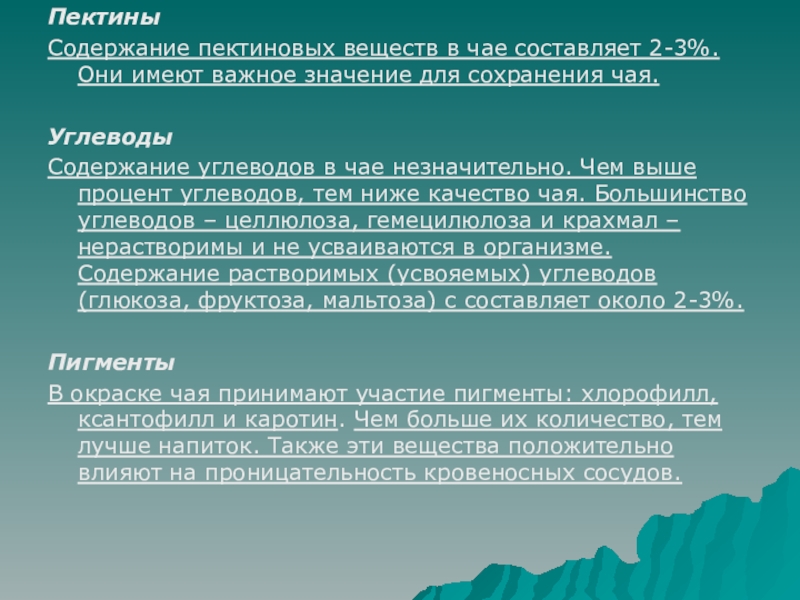 Содержание пектиновых веществ в чае составляет 2-3%. Они имеют важное значение