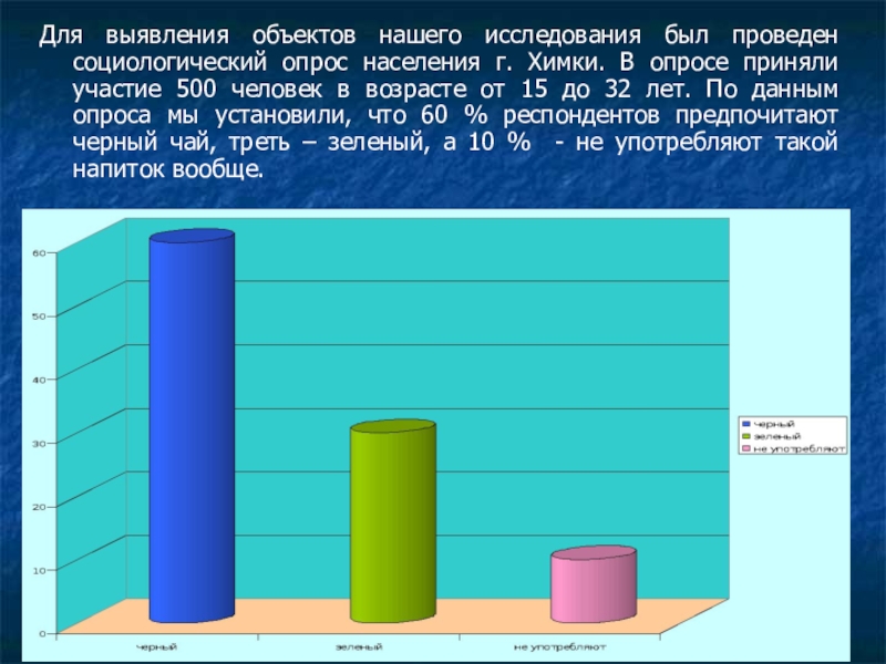 Химки. В опросе приняли участие 500 человек в возрасте от 15 до 32 лет. По данным опроса мы установили, что 60 % респондентов предпочитают черный чай, треть – зеленый, а 10 % - не употребляют такой напиток вообще.