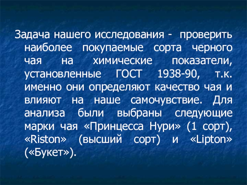 Слайд 29Задача нашего исследования - проверить наиболее покупаемые сорта черного чая на