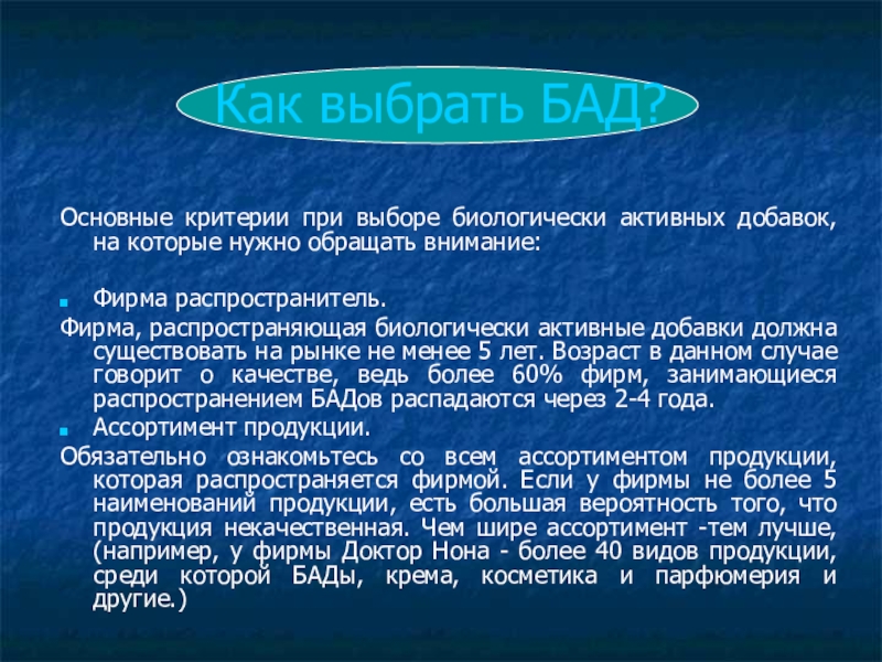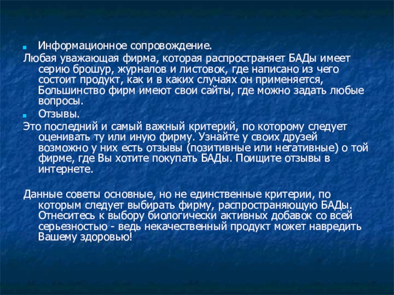 Данные советы основные, но не единственные критерии, по которым следует выбирать фирму, распространяющую БАДы. Отнеситесь к выбору биологически активных добавок со всей серьезностью - ведь некачественный продукт может навредить Вашему здоровью!