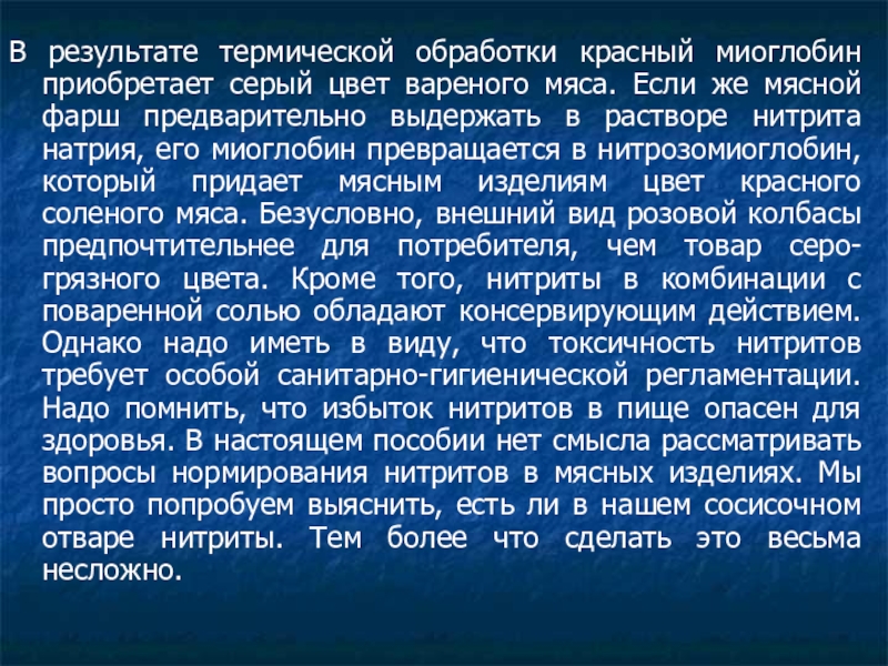 Несмотря на это, в пищевой промышленности нитриты широко применяются именно с целью нитрозировать миоглобин мяса. Дело в том, что этот хромопротеин придает сырому мясу характерный красный (кровяной) цвет.