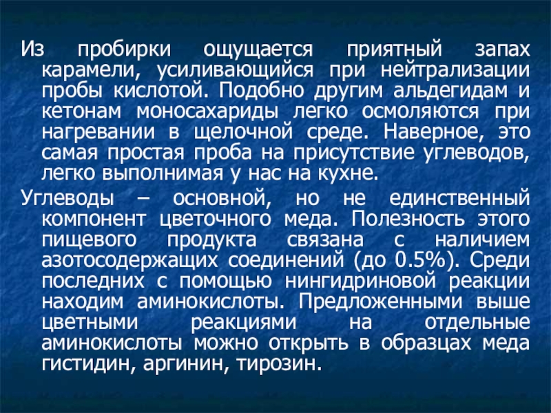 Слайд 17Из пробирки ощущается приятный запах карамели, усиливающийся при нейтрализации пробы кислотой.