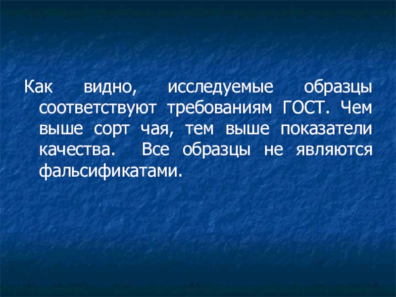 Слайд 34Как видно, исследуемые образцы соответствуют требованиям ГОСТ. Чем выше сорт чая,