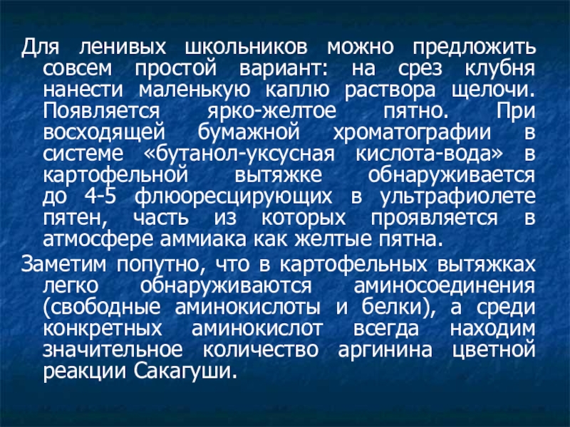 Заметим попутно, что в картофельных вытяжках легко обнаруживаются аминосоединения (свободные аминокислоты и белки), а среди конкретных аминокислот всегда находим значительное количество аргинина цветной реакции Сакагуши.