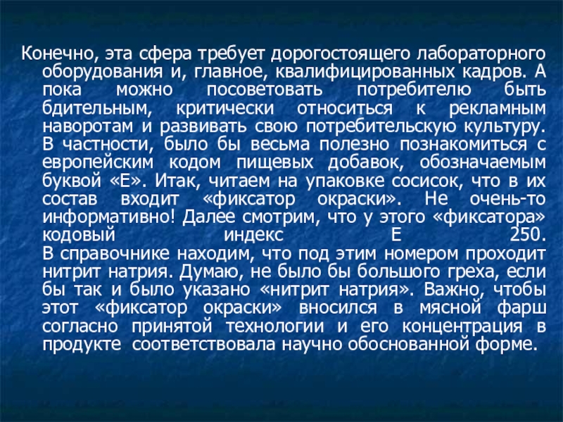А пока можно посоветовать потребителю быть бдительным, критически относиться к рекламным наворотам и развивать свою потребительскую культуру. В частности, было бы весьма полезно познакомиться с европейским кодом пищевых добавок, обозначаемым буквой «Е». Итак, читаем на упаковке сосисок, что в их состав входит «фиксатор окраски». Не очень-то информативно! Далее смотрим, что у этого «фиксатора» кодовый индекс Е 250.