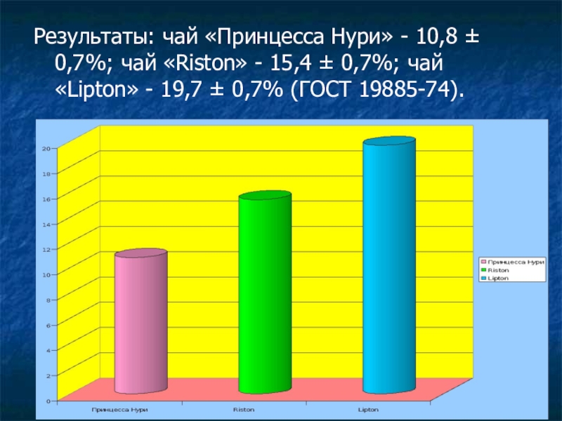 Слайд 33Результаты: чай «Принцесса Нури» - 10,8 ± 0,7%; чай «Riston» -